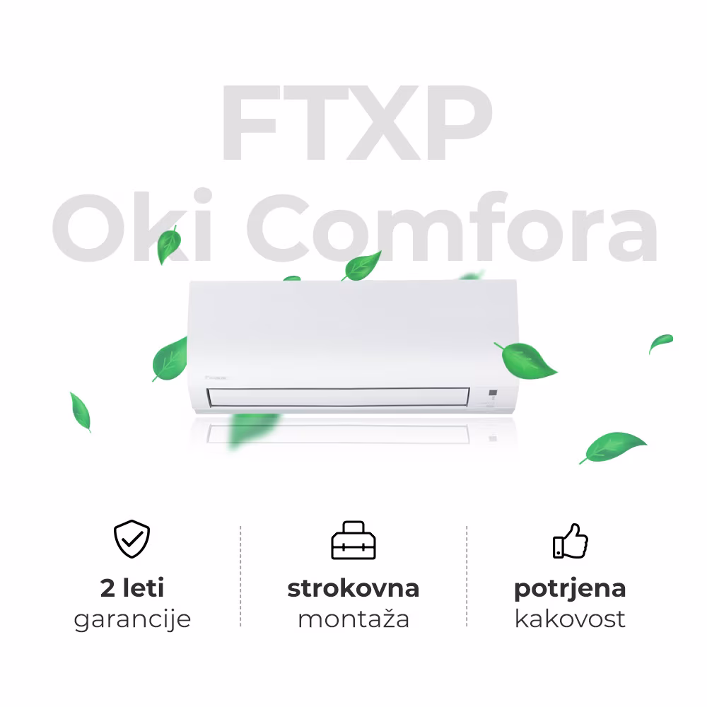 FTXP Oki Comfora je klimatska naprava, ki s filtrom iz titanovega apatita odstranjuje neprijetne vonjave in “lovi” plavajoče prašne in škodljive delce. Za odlično kakovost zraka!